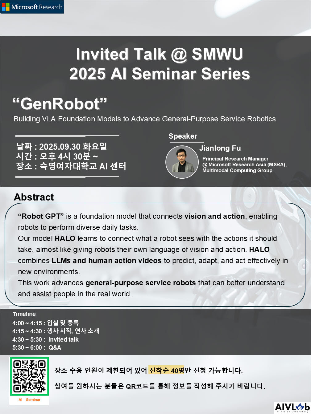 안녕하세요 소프트웨어학부 사무실입니다. 최근 AI, 로보틱스 동향에 맞춰 비교과 특강을 준비했습니다. 본 특강은 선착순 40명 (학부생 및 대학원생)까지 신청 가능하며, 반드시 비교과 신청과 QR 참여를 모두 완료해야 신청이 확정됩니다. ▶ 비교과 신청(링크):
